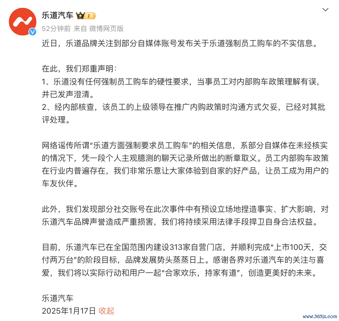 强制员工购买自家车辆?乐道汽车回应强制员工购买自家车辆?乐道汽车回应